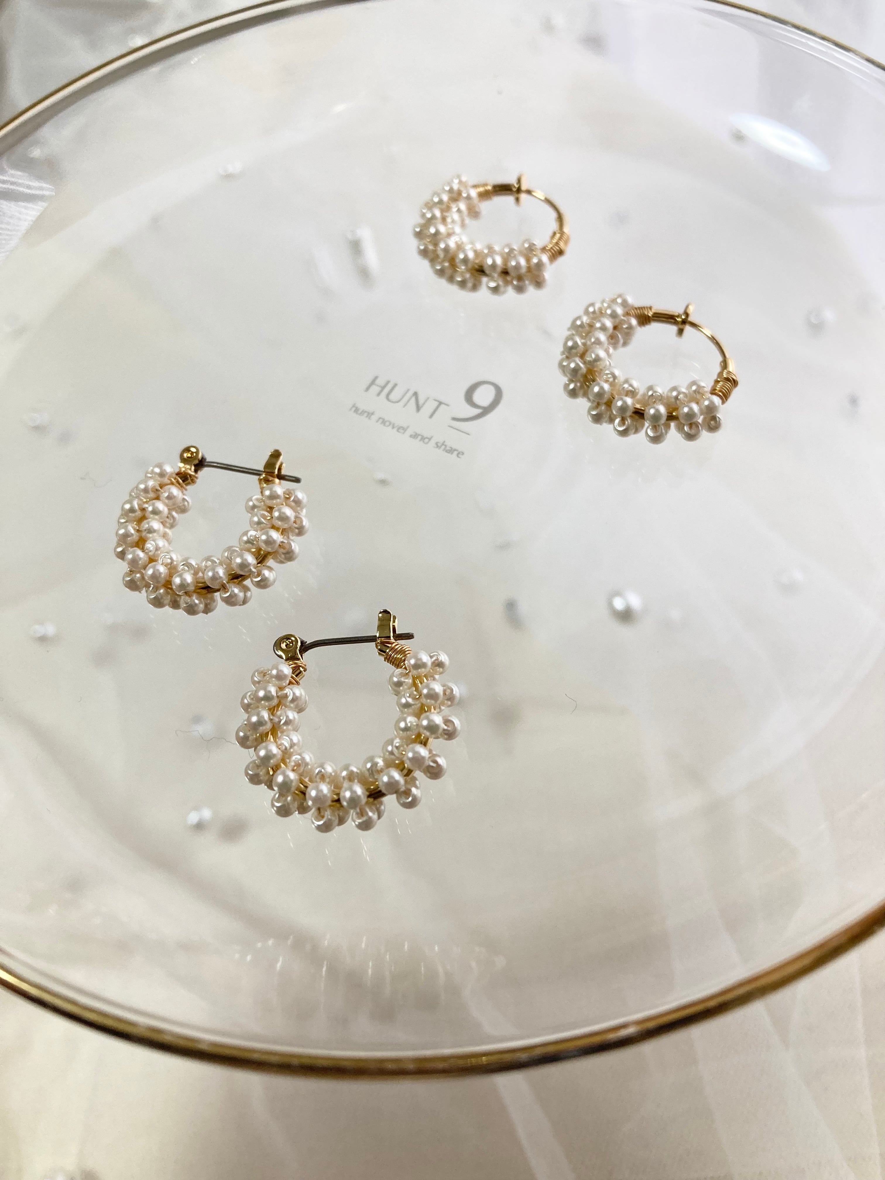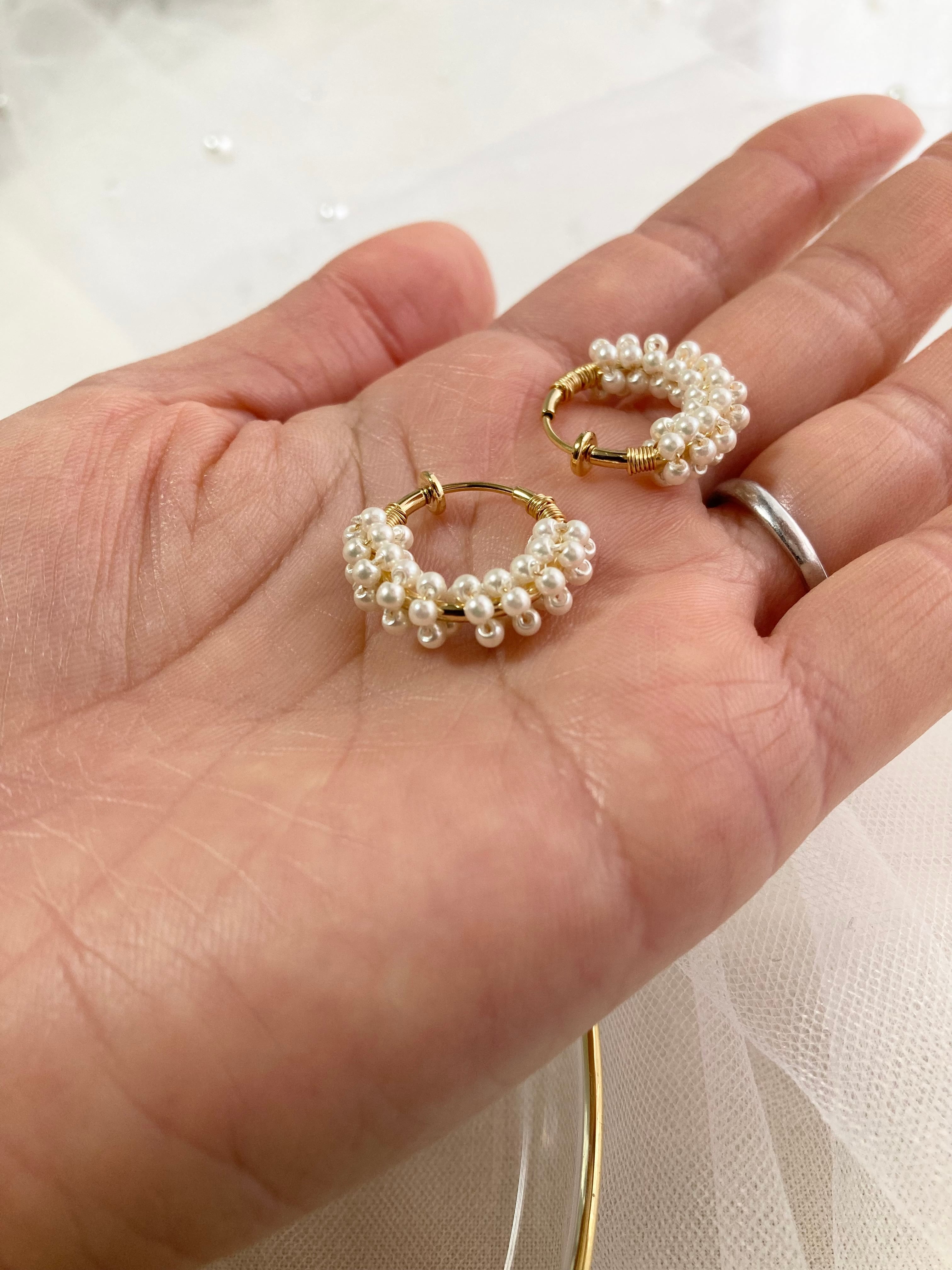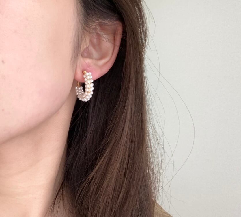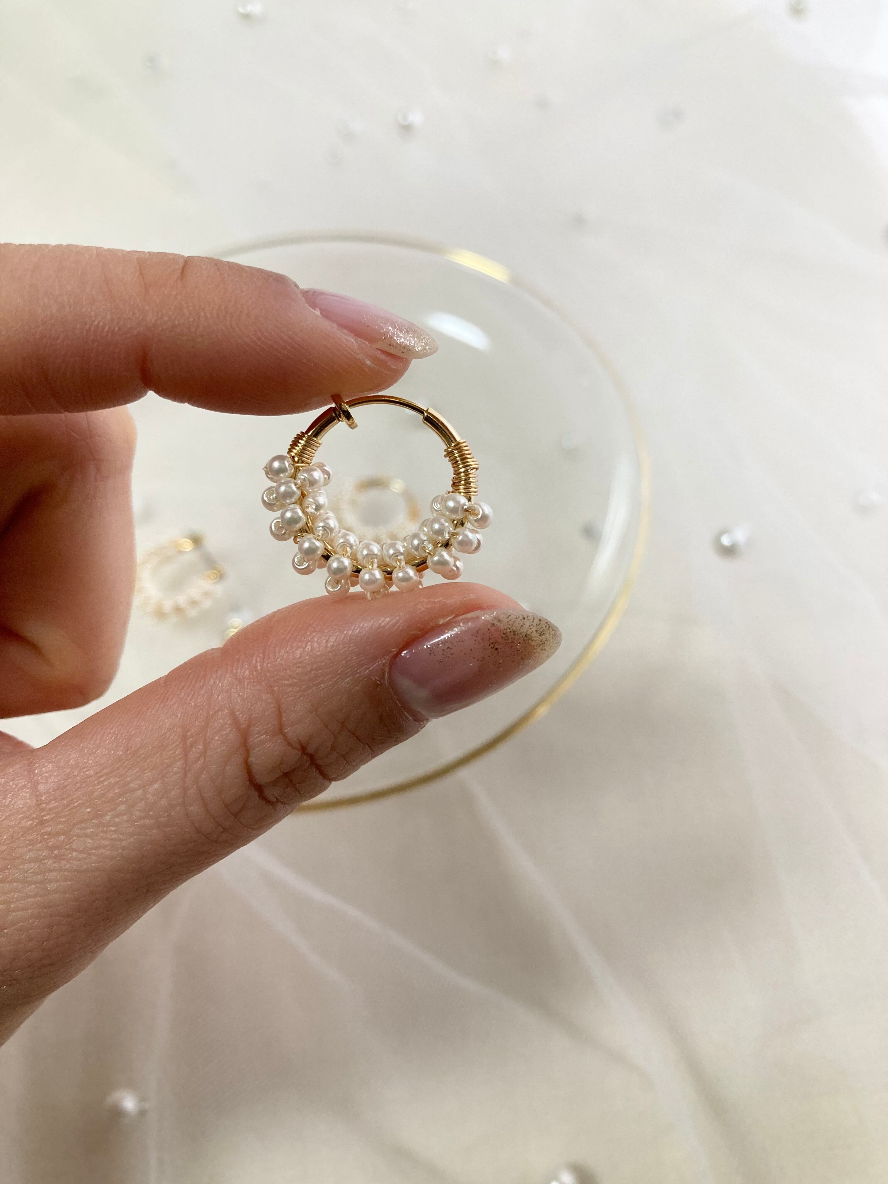華奢なサイズ感のminiフープに、ナチュラルなホワイトカラーの樹脂パールをワイヤーで丁寧に巻き付けました。