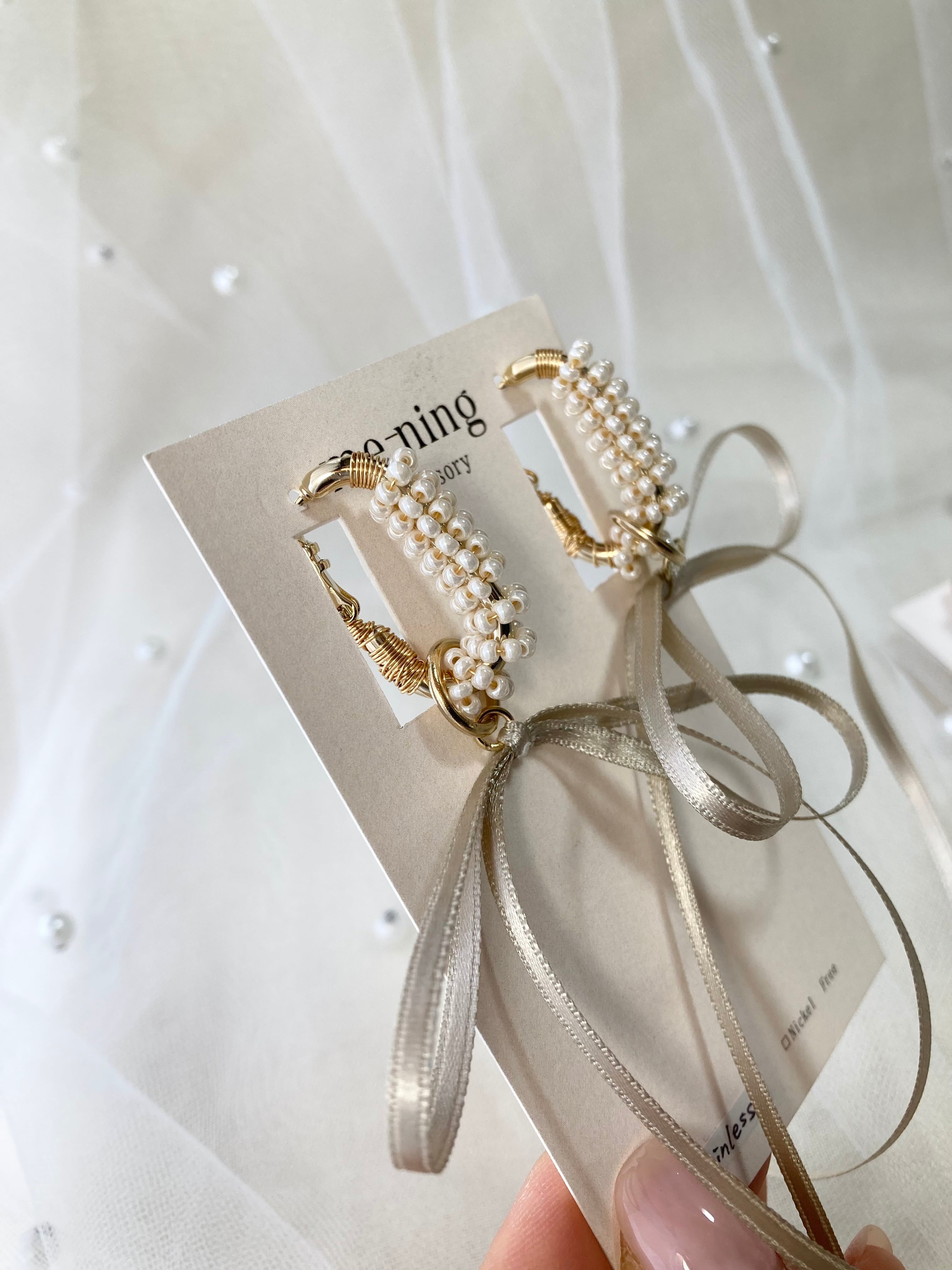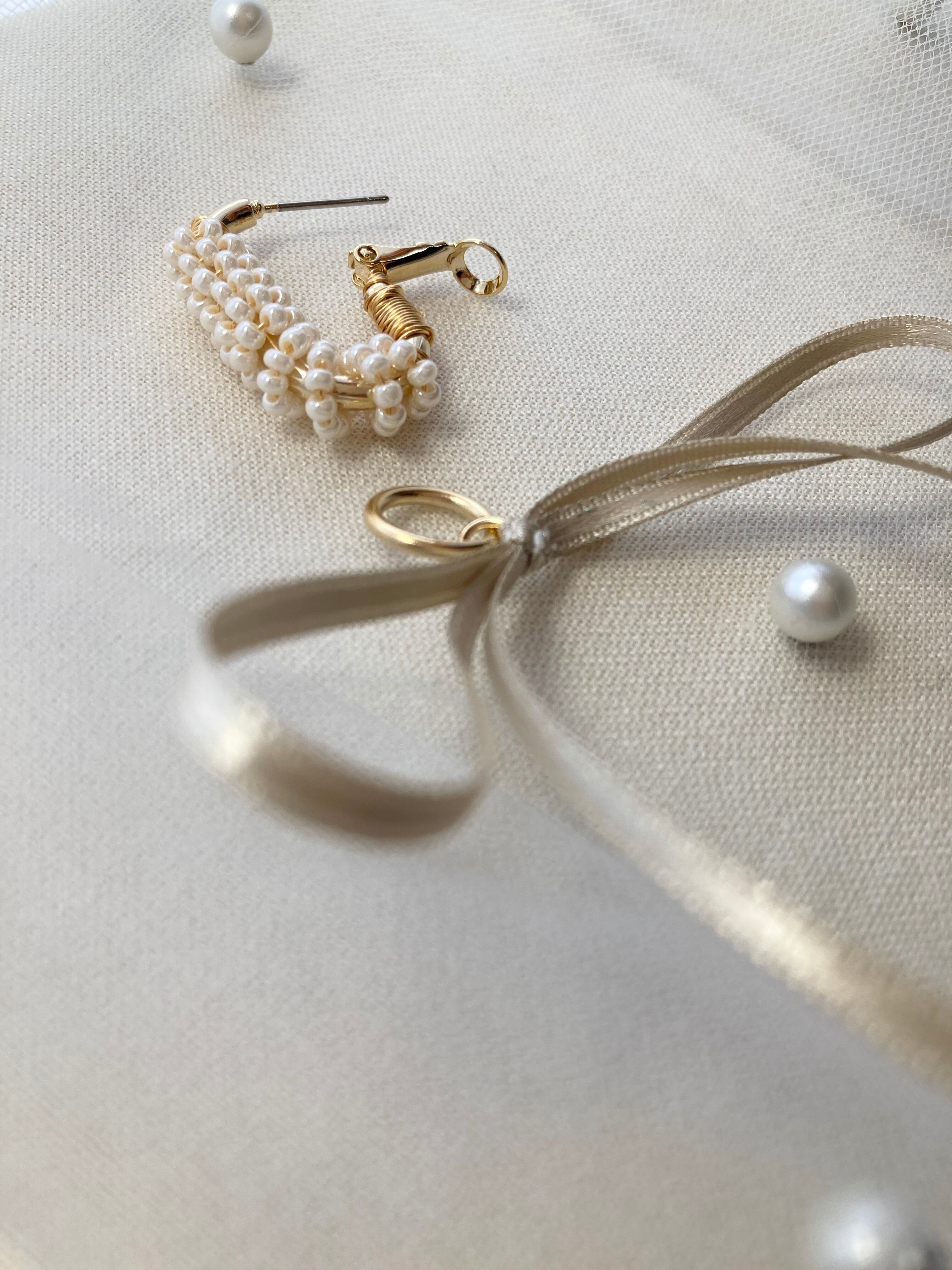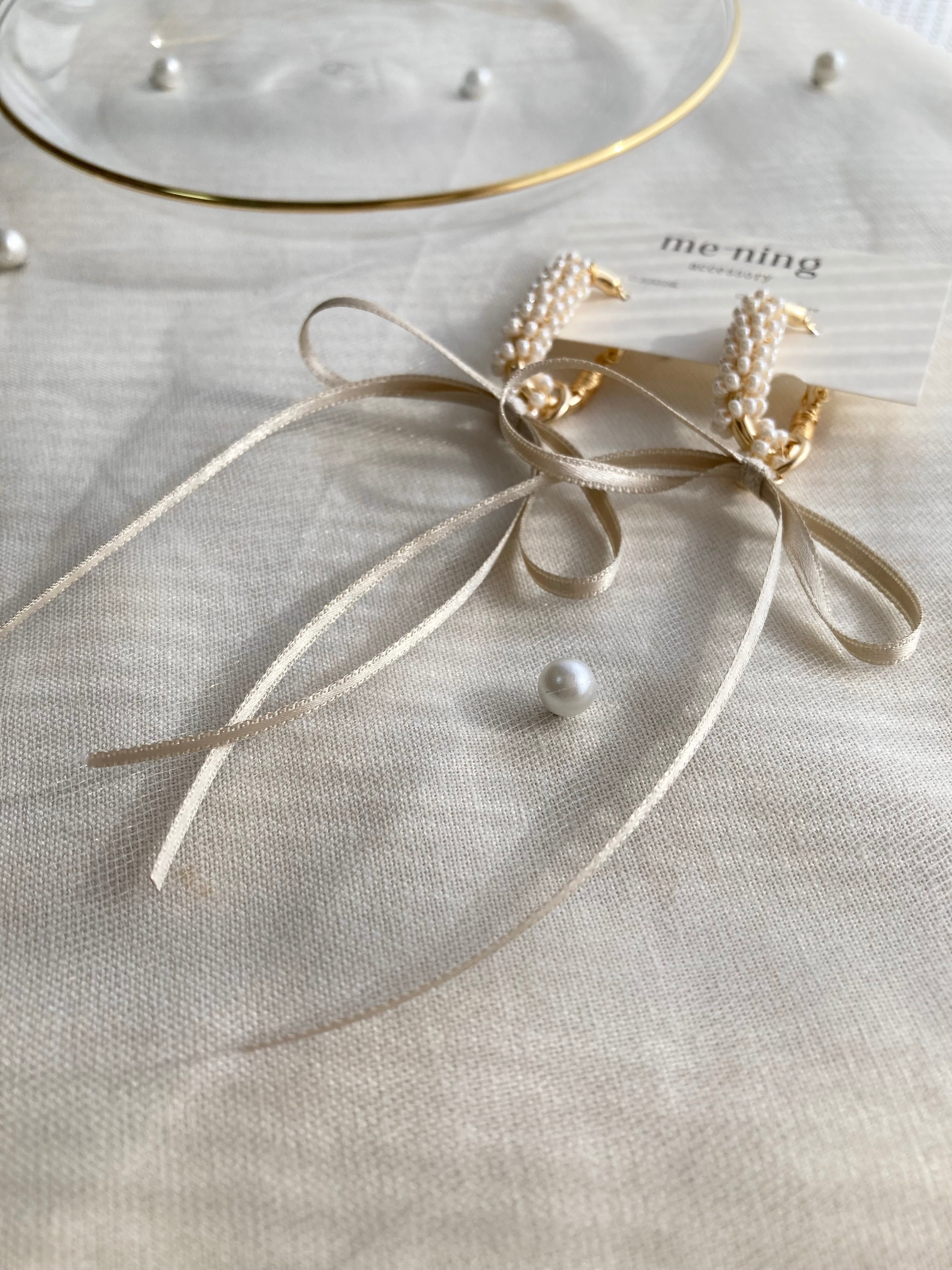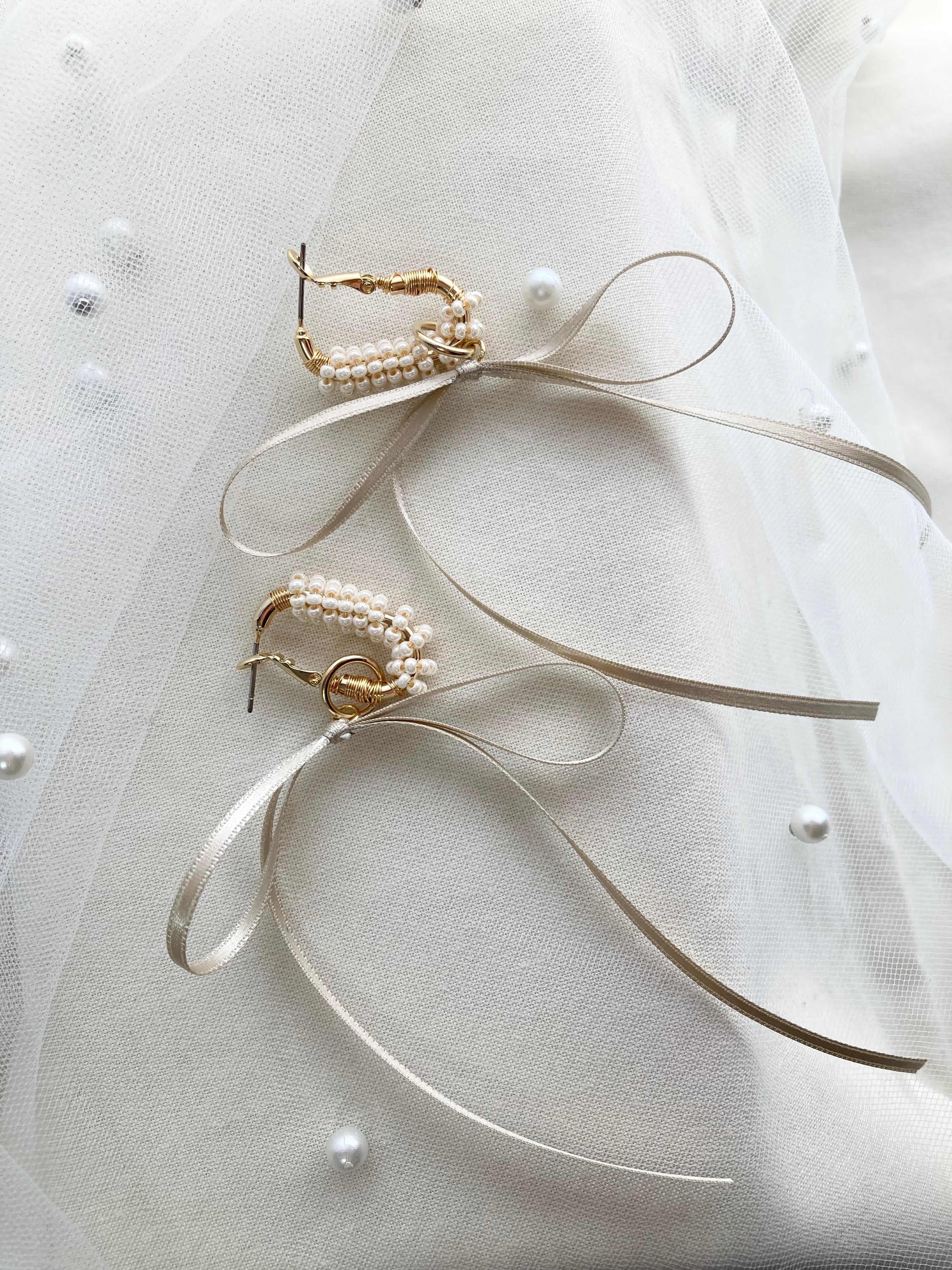 パール風ビーズを施したチャンキーフープに、ヌーディーなベージュカラーのサテンリボンを合わせました。