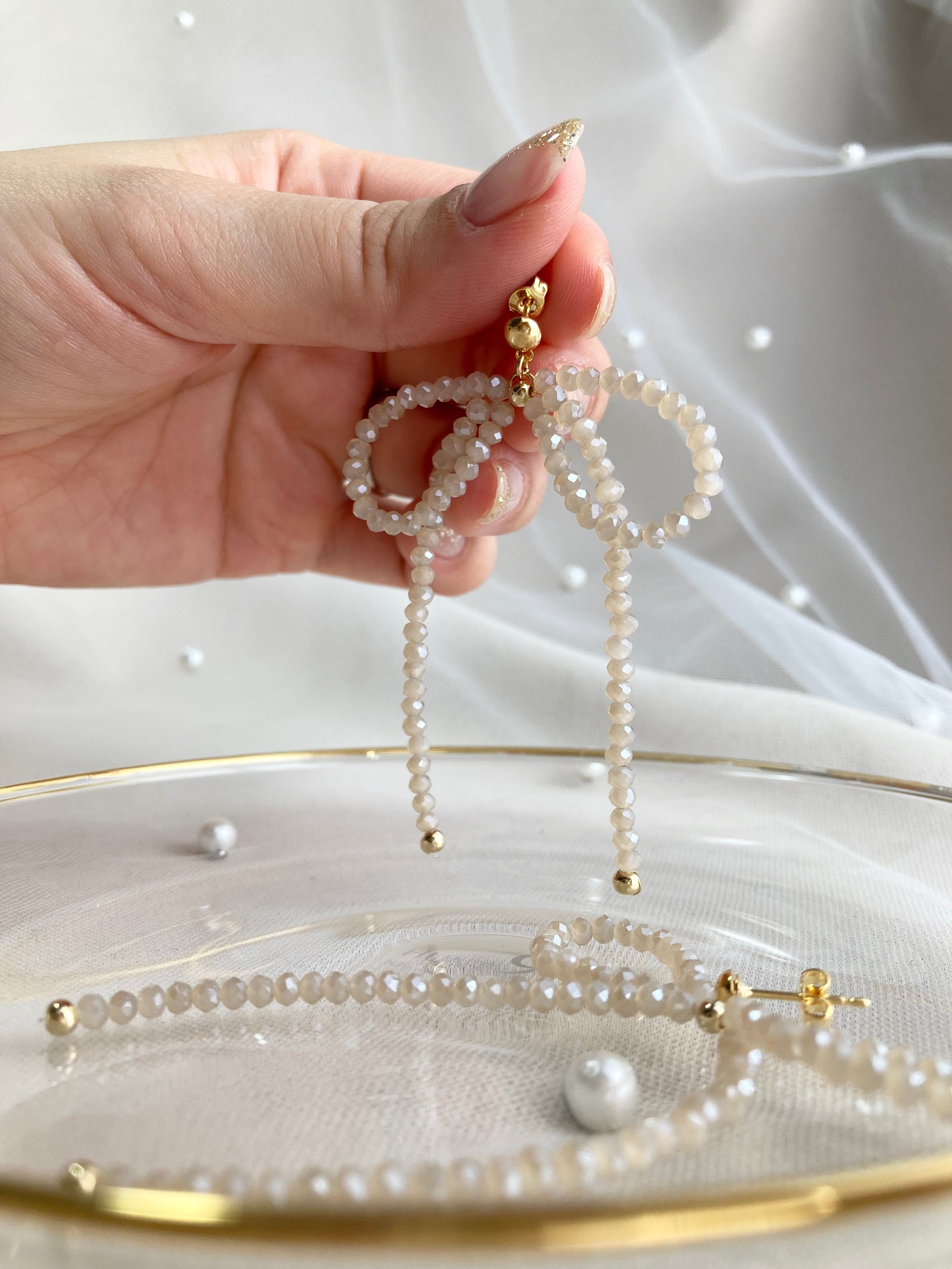 落ち着いたベージュカラーのガラスビーズで、ナチュラルな大人リボンをデザインしました♡